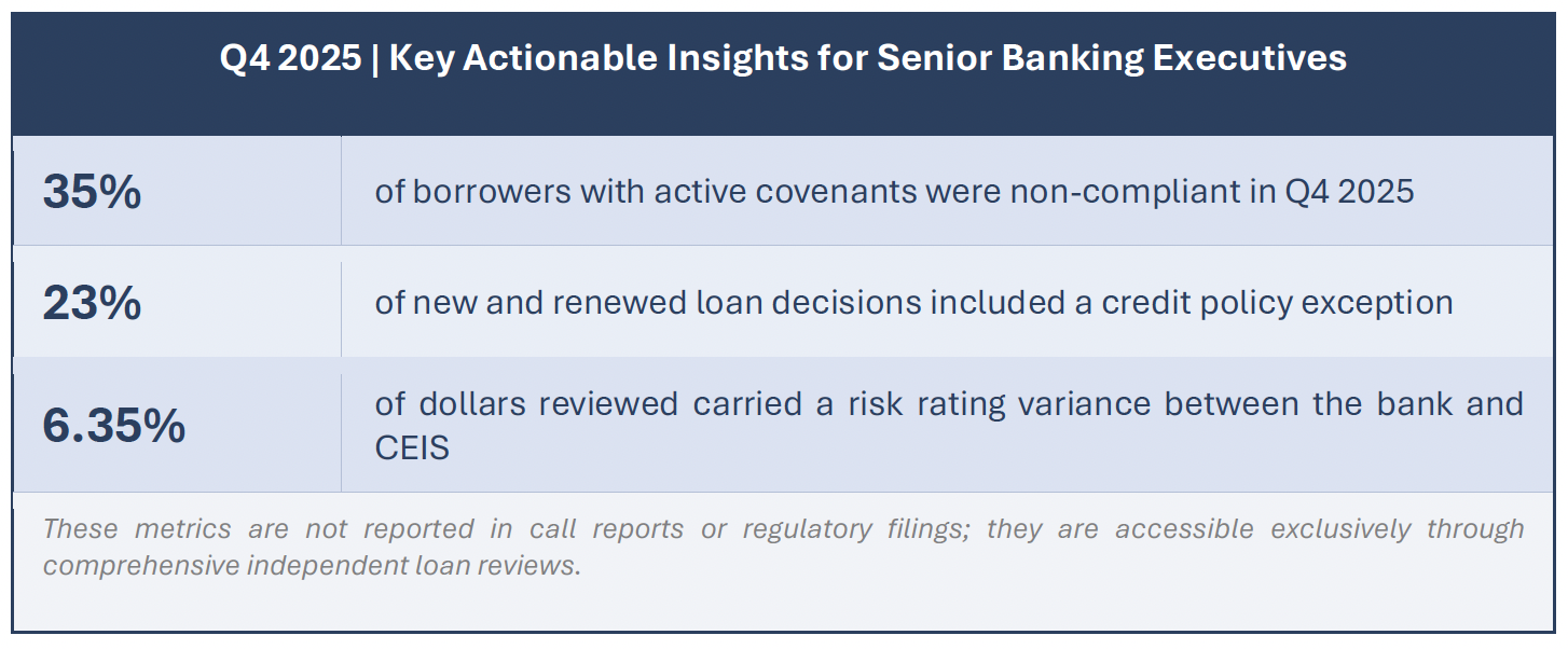 The CEIS Review Commercial Credit Observations (CCO) Report is published quarterly and reflects aggregated findings from active loan review engagements conducted across more than 100 community banks nationwide. Unlike peer analyses derived from call reports or regulatory filings, this report draws on loan-level data accessible only through independent credit review — including covenant compliance rates, credit policy exceptions, risk rating variances, and origination underwriting quality metrics. The Q4 2025 edition reflects portfolio conditions as of December 31, 2025.